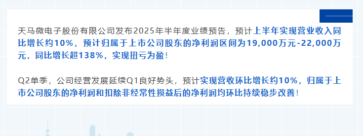 天馬微電子股份有限公司發(fā)布2025年半年度業(yè)績預(yù)告,預(yù)計上半年實(shí)現(xiàn)營業(yè)收入同比增長約10%,預(yù)計歸屬于上市公司股東的凈利潤區(qū)間為19,000萬元-22,000萬元,同比增長超138%,實(shí)現(xiàn)扭虧為盈!Q2